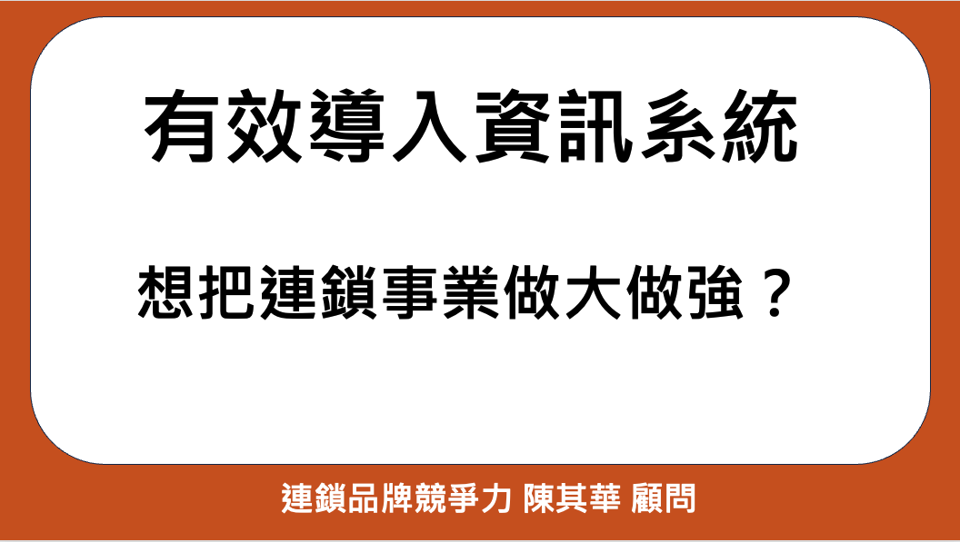 從POS、電子訂貨與內部管理ERP,到近年來的O2O線上線下互相導流、Google搜尋與諸多線上社群,及以客戶為中心的OMO線上線下融合。資訊科技的運用,早已經是連鎖事業經營中的大事。要有效發展品牌連鎖體系,資訊系統對打造完整的管理體質,是一個很重要的工作。當我們要知道一家店有沒有賺錢?哪些產品的利潤比較高?哪些產品的銷售量比較大?各項費用是否合理?